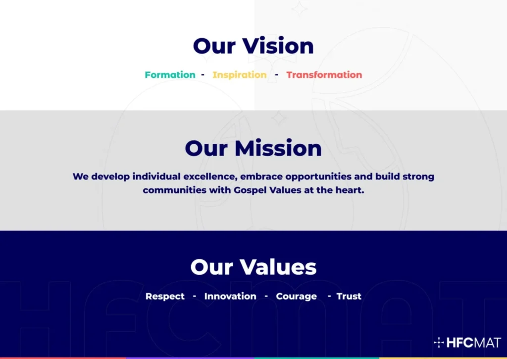 HFCMAT as an organisation holds itself to a set of core values that we aim to make evident in all of our work. These values mirror the professionalism and courtesy that our trainees experience within our Delivery Partners and with your school-based colleagues. Our standards are ambitious, but we feel they are applicable not only to us but to anyone involved in education, who wants to influence the lives and prospects of young people.